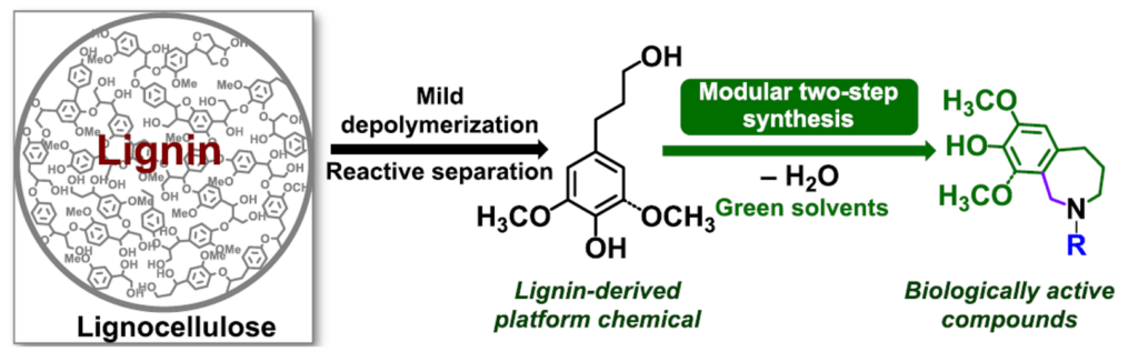 Lignin- and biomass-derived platform chemicals possess inherent structural complexity that serves as an excellent starting point for the development of atom-economic pathways to more complex, high-value products, specifically biologically active molecules and active pharmaceutical ingredients (APIs).